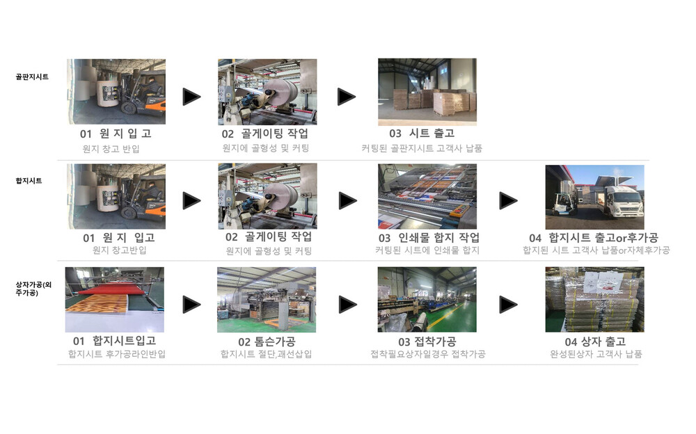 재활용이 가능한 골판지 시트 및 박스를 중심으로 제품군을 구성하고 있습니다.